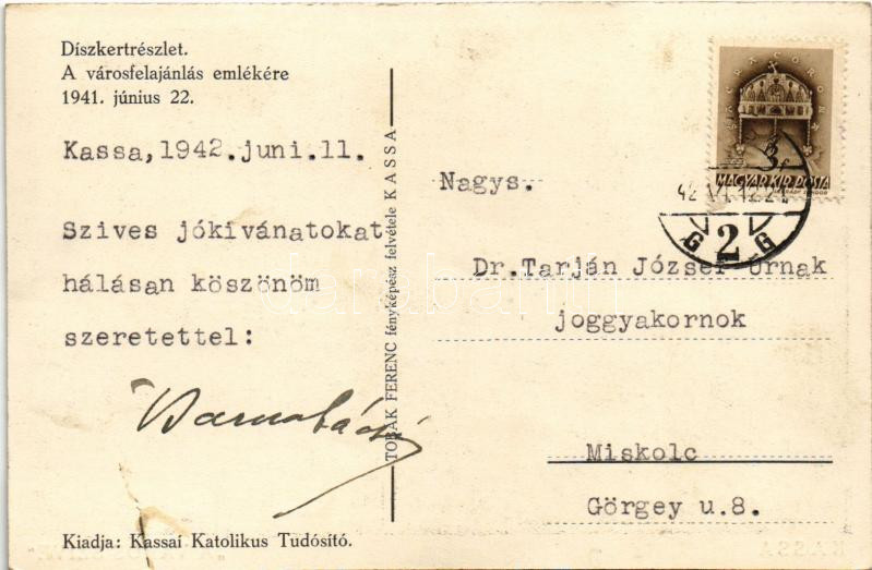 1942 Kassa, Kosice; A Város Szíve virágágyás és az országzászló. Tobák... https://www.darabanth.com/de/41-Gross-Auktion/41.1/Ansichtskarten/Slowakei~16960/1942-Kassa-Kosice-A-Varos-Szive-viragagyas-es-az-orszagzaszlo-Tobak-Ferenc-fenykepes~II2979382