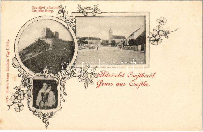 Beschreibung: Csejte, Csejthe, Cachtice; Cachticky hrad / Báthory Erzsébet vára, Fő tér. Brück Samu kiadása / Csejthe-Burg / castle. Art Nouveau, floral (fl)