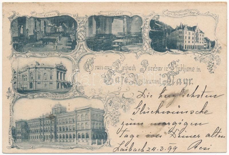 1899 (Vorläufer) Ljubljana, Laibach; Cafe Restaurant Mayr., Billardzimmer, Lesesaal, Theater, K.k. Oberrealschule. J. Horowitz / cafe and restaurant interior, reading hall and billiard room, theatre, school. Art Nouveau, floral (wet damage)