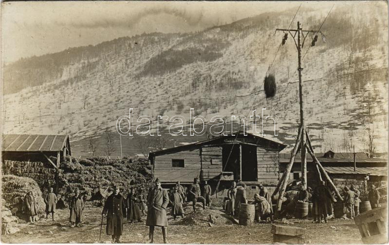 Cepovan, Chiapovano, Tschepobon; első világháborús osztrák-magyar katonai drótkötélpálya teherszállításhoz, M. Eduard boltja / WWI K.u.k. (Austro-Hungarian) military ropeway transport, shop. photo (fl)