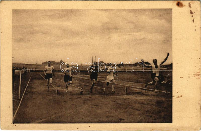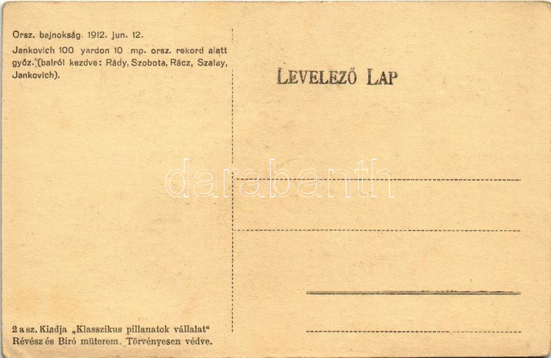 1912 június 12. Atlétikai Magyar Bajnokság: Jankovich 100 yardon 10 másodperc országos rekord alatt győz (balról: Rády, Szobota, Rácz, Szalay, Jankovich). Kiadja a Klasszikus pillanatok vállalat, Révész és Biró műterem. 2. sz. / Hungarian Athletics Championships, sport (fl)