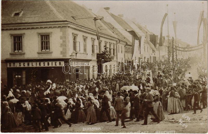 Beschreibung: Namest nad Oslavou, Masarykovo Namestie, Banderium / festival on the streets, shop of St. Schliksbier. photo