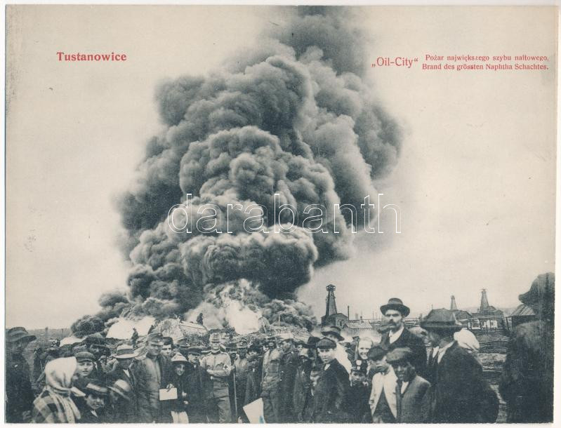 Tustanovichi, Tustanovitse, Tustanowice (Boryslav, Boryslaw); Oil City / Pozar najwiekszego szíbu naftowego. Leon Rosenschein Drohobycz 1908. / Brand des grössten Naphtha Schachtes / Fire in the largest oil well (2-tiled unfolded panoramacard)