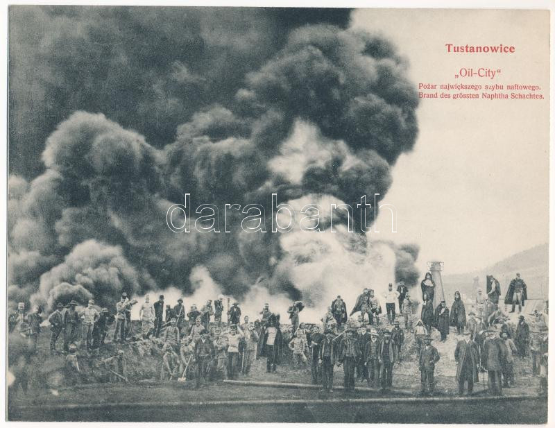 Tustanovichi, Tustanovitse, Tustanowice (Boryslav, Boryslaw); Oil City / Pozar najwiekszego szíbu naftowego. Leon Rosenschein Drohobycz 1908. / Brand des grössten Naphtha Schachtes / Fire in the largest oil well (2-tiled unfolded panoramacard)