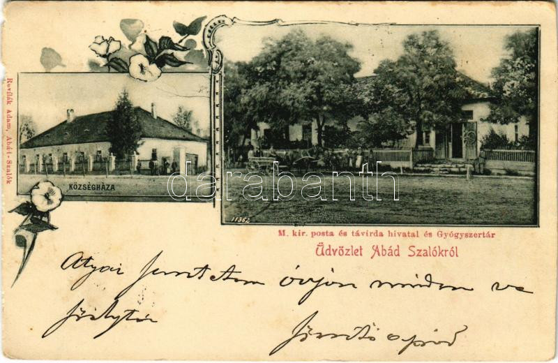 Beschreibung: 1899 (Vorläufer) Abádszalók, községháza, M. kir. posta és távirda hivatal, gyógyszertár. Revílák Ádám kiadása Art Nouveau, floral (szakadások / tears)