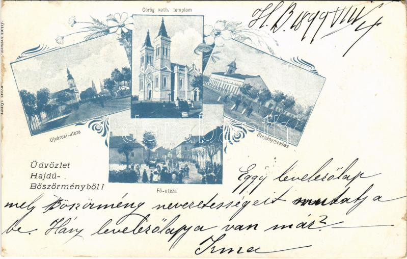 Beschreibung: 1899 (Vorläufer) Hajdúböszörmény, Görögkatolikus templom, Szegénymenház, Fő utca, piac, Újvárosi utca. Lányi Géza kiadása. Art Nouveau, floral (vágott / cut)