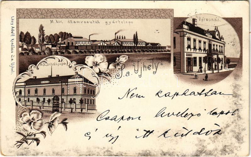 1899 (Vorläufer) Sátoraljaújhely, M. kir. államvasutak (MÁV) gyártelepe, dohánygyár, városháza. Lövy Adolf kiadása. Art Nouveau, floral, litho + "S-A-UJHELY P. UDV."