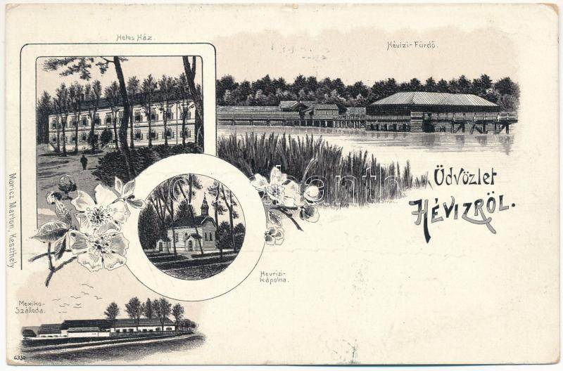 Beschreibung: 1901 Hévíz, Hetes Ház, fürdő, Mexikó szálloda, kápolna. Moricz Marton kiadása, Art Nouveau, floral, litho (apró szakadás / tiny tear)
