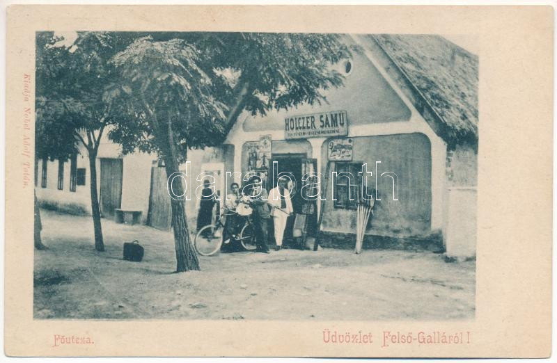 Beschreibung: 1903 Felsőgalla (Tatabánya), Fő utca, Holczer Samu üzlete (fl)