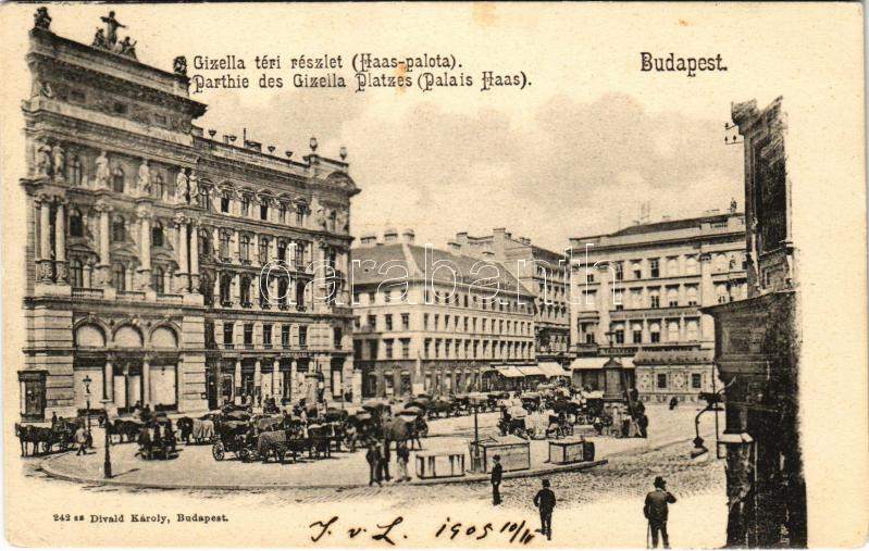 1905 Budapest V. Gizella tér (ma Vörösmarty tér), Haas palota, piac, Pesti Magyar Kereskedelmi Bank, Szenes Ede üzlete, Magyar Király szálloda. Divald Károly 242.