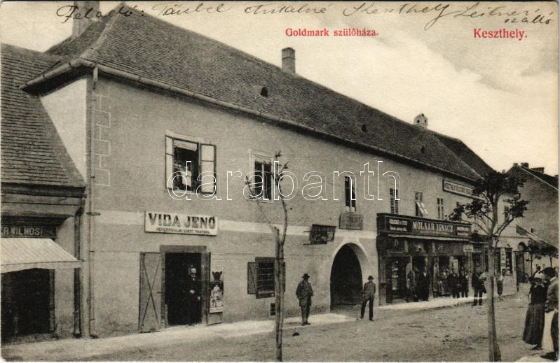 1911 Keszthely, Goldmark Károly zsidó zeneszerző szülőháza, Vida Jenő hengermalmi liszt raktára, Molnár Ignác ezelőtt Pető Vilmos és Rosenberg Benő üzlete. Mérei Ignác 1910.