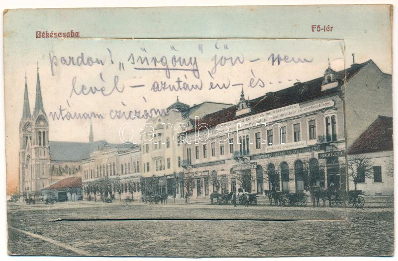 1912 Békéscsaba, FÅ‘ tér, Gesmey Soma könyv- és papÃrkereskedése, Békésmegyei Függetlenség könyvnyomdája, kiadóhivatala és szerkesztÅ‘sége, Polgári leányiskola, Ipar és népbank fiókintézete, udvari fényképész, Schreyer József üzlete. Gesmey Soma saját kiadása - 10 képes leporello a vasútállomással