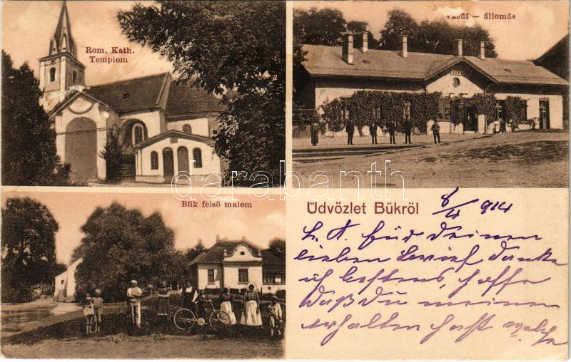 1914 Bük, Római katolikus templom, Felső malom, vasútállomás (EK) https://www.darabanth.com/de/41-Gross-Auktion/41.1/Ansichtskarten/Ungarn~16958/1914-Buk-Romai-katolikus-templom-Felso-malom-vasutallomas-EK~II2991628