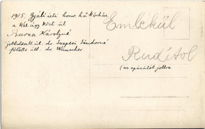 1915 Budapest IX. Gyáli úti honvéd helyőrségi kórház, Burza Károlyné, ... https://www.darabanth.com/de/41-Gross-Auktion/41.1/Ansichtskarten/Ungarn~16958/1915-Budapest-IX-Gyali-uti-honved-helyorsegi-korhaz-Burza-Karolyne-dr-Szepesi-SandornC3~II3009281