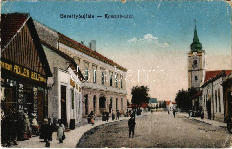1921 Berettyóújfalu, Kossuth utca, templom, Oroszlán szálloda, Adler B... https://www.darabanth.com/de/41-Gross-Auktion/41.1/Ansichtskarten/Ungarn~16958/1921-Berettyoujfalu-Kossuth-utca-templom-Oroszlan-szalloda-Adler-Bela-uzlete-es-sajat-ki~II3008155