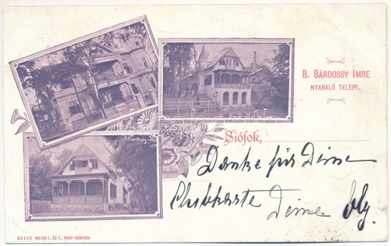 ~1899 (Vorläufer) Siófok, B. Bárdossy Imre nyaraló telepe, villa. Weis... https://www.darabanth.com/de/41-Gross-Auktion/41.1/Ansichtskarten/Ungarn~16958/7E1899-Vorlaufer-Siofok-B-Bardossy-Imre-nyaralo-telepe-villa-Weiss-L-es-F-kiadasa-Art-~II3008217
