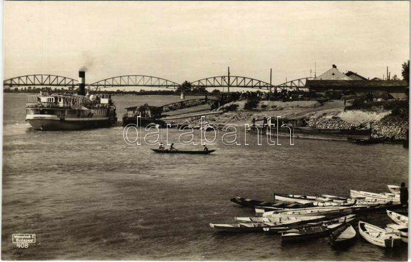Beschreibung: Baja, Duna részlet a hajóállomással, "Szent László" oldalkerekes gőzhajó, Baja-Bátaszék vasúti híd, evezősök. Csermák és Schwéger kiadása