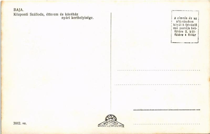 Baja, Központi szálloda, étterem és kávéhát nyári kerthelyisége https://www.darabanth.com/de/41-Gross-Auktion/41.1/Ansichtskarten/Ungarn~16958/Baja-Kozponti-szalloda-etterem-es-kavehat-nyari-kerthelyisege~II2980280