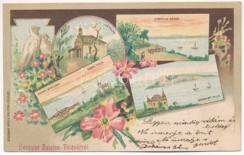 Beschreibung: Balatonföldvár, Zrínyi szálloda, Nessi és Schmidt villa, Stefánia sánc, kápolna. Gerenday Gyula kiadása, Art Nouveau, floral, litho