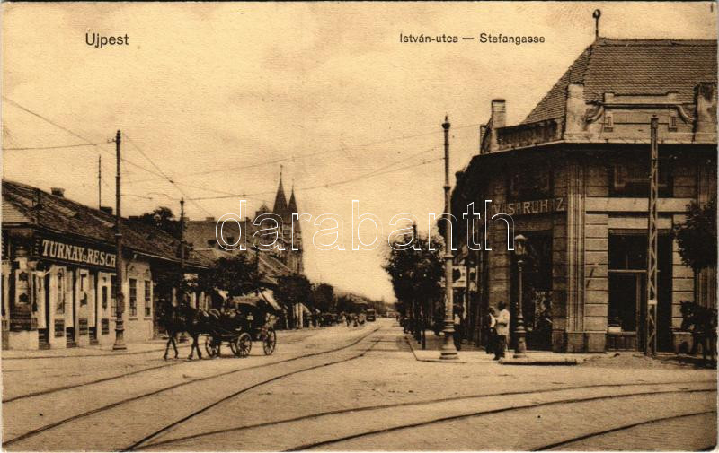 Beschreibung: Budapest IV. Újpest, István utca, villamos, vasáruház, Turnay és Resch üzlete