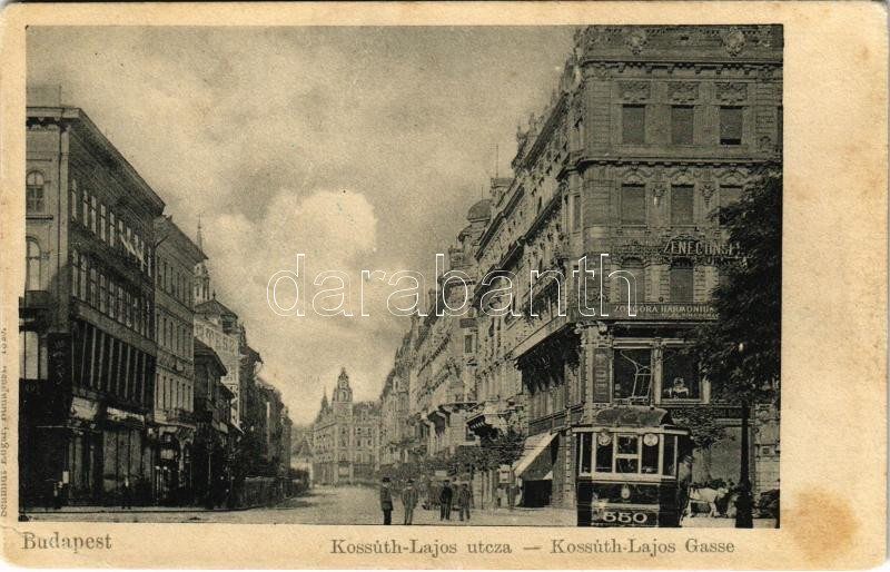 Beschreibung: Budapest V. Kossuth Lajos utca, Zene conservatorium, Sternberg zongora üzlete, villamos (fl)