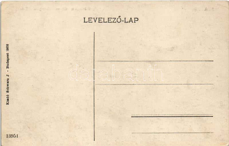Budapest VI. Andrássy út és Oktogon tér, villamos, Altenburger János M. kir. Operaház tag vezetése alatt álló zeneiskola, akadémiai előkészítő tanfolyam, Adler Miksa Szabadalmi ügyvivői iroda, Bass Sarolta női ruha üzlete, Menton kávéház, villamos, Hunter Whisky reklám. Schwarz J. 1908.