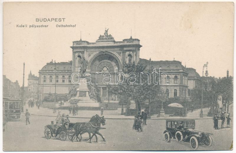 Beschreibung: Budapest VII. Keleti pályaudvar, vasútállomás, montázs autóval, hintóval és villamossal (EK)