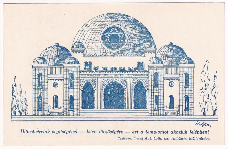 Budapest XVIII. Pestszentlőrinc, Pusztaszentlőrinc, Szentlőrinc; Pestszentlőrinci Autonóm Orthodox Izraelita Hitközség Elöljárósága által tervezett zsinagóga. Hittestvéreink segítségével - Isten dicsőségével - ezt a templomot akarjuk felépíteni. Judaika / Judaica
