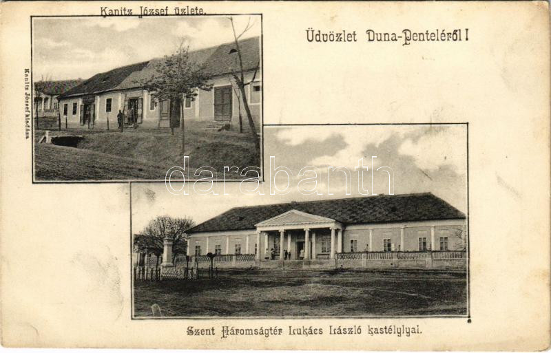 Beschreibung: Dunaújváros, Dunapentele, Sztálinváros; Lukács László kastélya a Szentháromság téren, Kanitz József üzlete és saját kiadása (ázott / wet damage)