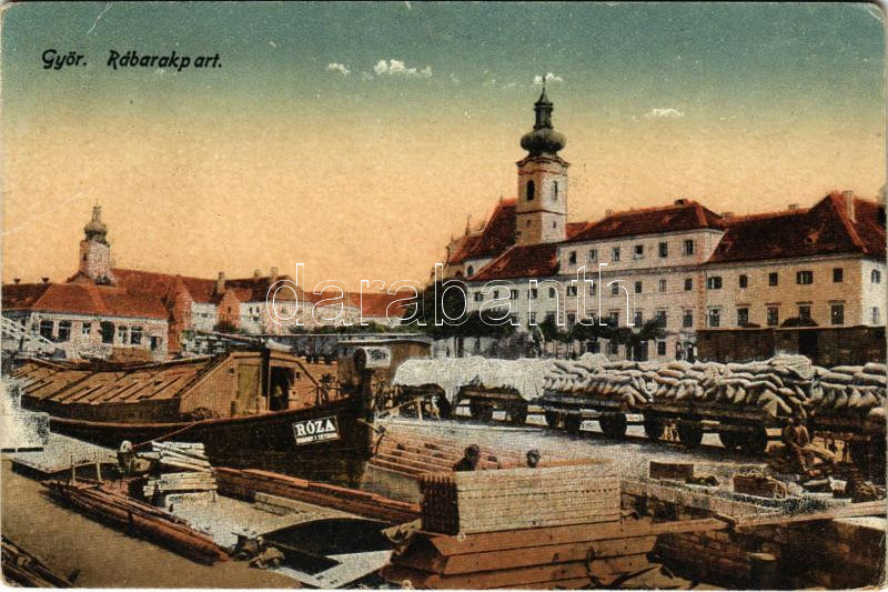 Győr, Rába rakpart iparvasúttal, templom, "Róza" Komáromy F.... https://www.darabanth.com/de/41-Gross-Auktion/41.1/Ansichtskarten/Ungarn~16958/Gyor-Raba-rakpart-iparvasuttal-templom-Roza-Komaromy-F-Esztergom-halaszbarka-fa~II3008593