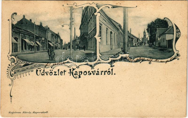 Beschreibung: Kaposvár, Fő utca, Mayer Antal üzlete, Zárda utca, Református templom. Hagelman Károly kiadása. Art Nouveau (fl)