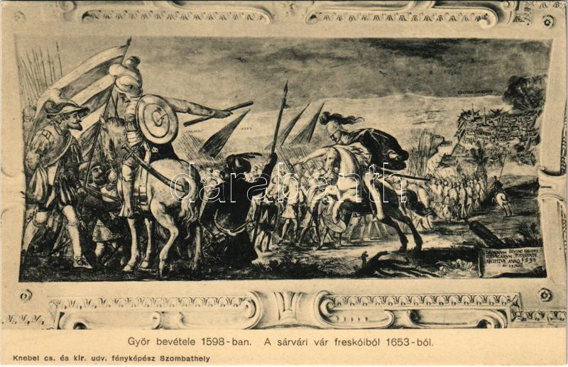 Beschreibung: Sárvár, a sárvári vár freskóiból 1653-ból: Győr bevétele 1598-ban. Knebel cs. és kir. udvari fényképész (ragasztónyom / glue mark)