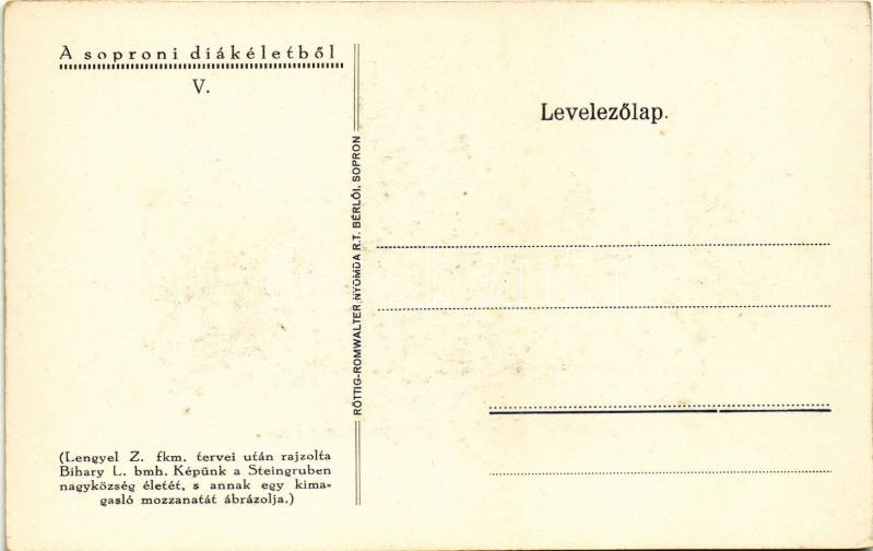 Sopron, A soproni diákéletből V. Nagykösségi kupaktanács. Lengyel Z. fkm. tervei után rajzolta Bihary L. bmh. Képünk a Steingruben nagyközség életét, s annak egy kimagasló pillanatát ábrázolja. Röttig-Romwalter nyomda rt. bérlői. Studentika. s: Bihary L.