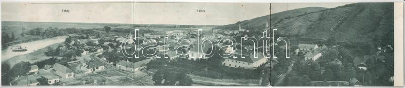 Beschreibung: Tokaj, látkép zsinagógával. 3-részes kihajtható panorámalap / 3-tiled folding panoramacard with synagogue (hajtásnál szakadt / torn at fold)