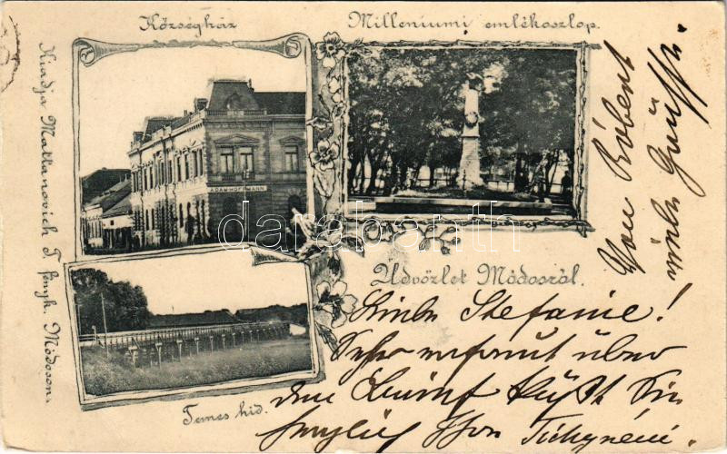 1898 (Vorläufer) Módos, Jasa Tomic; községháza, Milleniumi emlékoszlop... https://www.darabanth.com/de/41-Gross-Auktion/41.1/Ansichtskarten/Vojvodina~16963/1898-Vorlaufer-Modos-Jasa-Tomic-kozseghaza-Milleniumi-emlekoszlop-Temes-hid-Mattanovic~II3007931