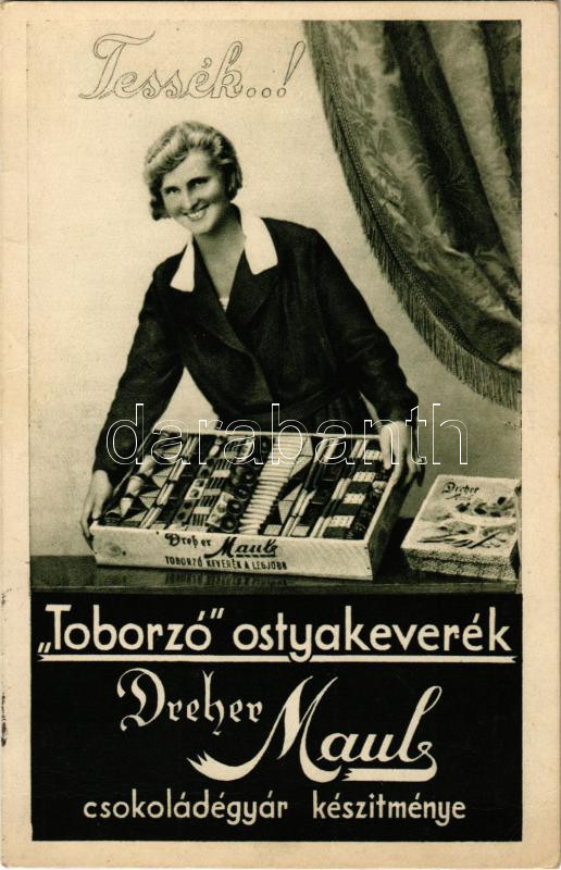 Beschreibung: Toborzó ostyakeverék. Dreher Maul csokoládégyár reklámlapja / Hungarian chocolate wafer advertising card (EK)