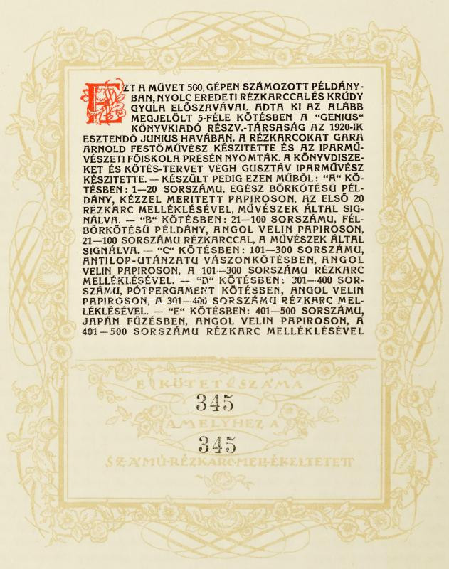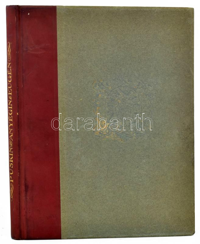 Puskin Sándor: Anyégin Eugén. Regény versekben. Ford.: Bérczy Károly. Krúdy Gyula előszavával, Gara Arnold eredeti rézkarcaival. Bp., 1920, Génius, 238+(2) p. + 8 (rézkarcok) t. Kiadói "D"-kötésben (,,301-400 sorszámu, pótpergament kötésben, angol velin papiroson"), kissé kopott borítóval, a gerincen apró sérüléssel. Számozott (345./500) példány.