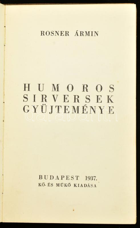 Rosner Ármin: Nevető fejfák. Humoros sírversek gyűjteménye. Bp., 1937, Kő- és Műkő kiadása (May-ny.), 111 p. A rajzokat részben Holbein metszetek nyomán Jantschi Béla készítette. Kiadói egészvászon-kötés, kissé foltos borítóval, helyenként minimálisan foltos lapokkal.