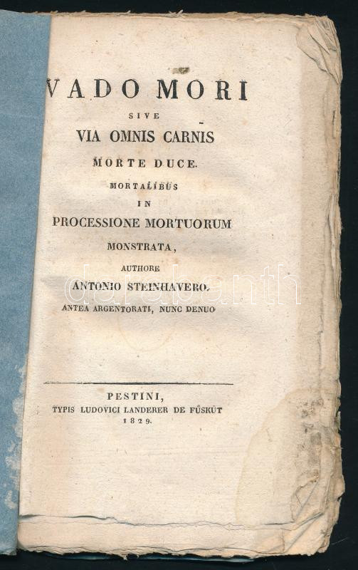Steinhaver, Anton: Vado Mori (Haláltánc) sive Via omnis carnis morte duce. Mortalibus in processione mortuorum monstrata. Pestini, 1829. fűskuti Landerer. 67p. Korabeli papírborítóban.