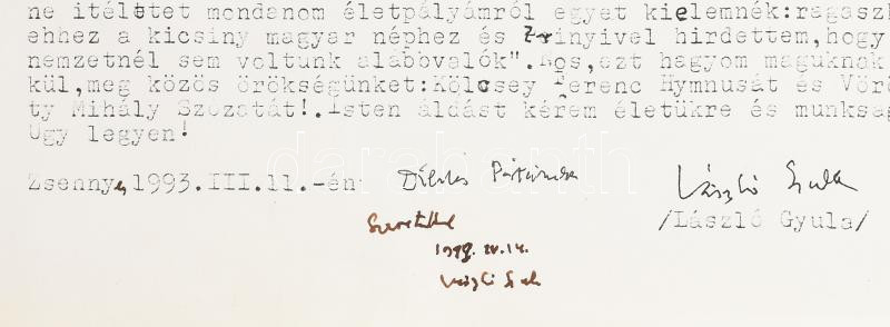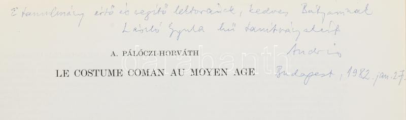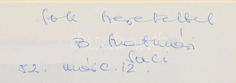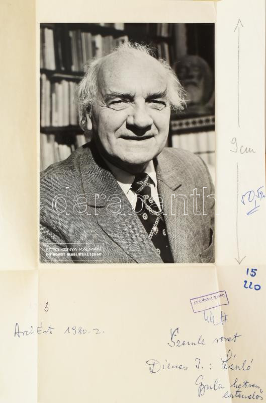 1980-1982-1998 László Gyula (1910-1998) régész-történész, képzőművész részére (3 db), és Dienes István (1929-1995) régész részére, az írók által DEDIKÁLT különlenyomatok (9 db): Bóna István: Studien zum frühawarischen Reitergrab von Szegvár. László Gyula részére DEDIKÁLT! Acta Archaeologica Academiae Scentiarum Hungaricae. Bp., 1980, (Akadémiai-ny.,)31-95 p.; [B.] Szatmári Sarolta: Das Gräbenfeld von Oroszlány und seine Stelle in der frühawarenzeitlichen Metallkunst. László Gyula részére DEDIKÁLT! Acta Archaeologica Academiae Scentiarum Hungaricae. Bp., 1980, (Akadémiai-ny.), 97-116 p.; Kőhegyi Mihály: Das landnahmezeitliche Gräberfeld von Madaras (Komitat Bacs-Kiskun.) Dienes István részére DEDIKÁLT! Acta Archaeologica Academiae Scentiarum Hungaricae. Bp., 1980, (Akadémiai-ny.), 205-239 p. Mesterházy Károly: Ein landnahmezeitlicher Sattel aus Ártánd. Dienes István részére DEDIKÁLT! Acta Archaeologica Academiae Scentiarum Hungaricae. Bp., 1980, (Akadémiai-ny.), 295-308 p. Kovács László: Der Säbel von Benepuszta. Dienes István részére DEDIKÁLT! Acta Archaeologica Academiae Scentiarum Hungaricae. Bp., 1980, (Akadémiai-ny.), 309-316 p.; Horváth István: Ein weiteres Fragment der Esztergomer Porta Speciosa. Dienes István részére DEDIKÁLT! Acta Archaeologica Academiae Scentiarum Hungaricae. Bp., 1980, (Akadémiai-ny.), 345-362 p. H. Kolba Judit: Der Nyári-Kelch. Dienes István részére DEDIKÁLT! Acta Archaeologica Academiae Scentiarum Hungaricae. Bp., 1980, (Akadémiai-ny.), 373-402 p.; Pálóczi-Horváth András: Le costume coman au moyen age. László Gyula részére DEDIKÁLT! Acta Archaeologica Academiae Scentiarum Hungaricae. Bp., 1980, (Akadémiai-ny.), 403-427 p.; Gádor Judit: Ausgrabung in der Erdburg von Abaújvár. Eine Kirche in der Gespanschaftsburg. Dienes István részére DEDIKÁLT! Acta Archaeologica Academiae Scentiarum Hungaricae. Bp., 1980, (Akadémiai-ny.), 443-454 p.; 1980 Valamint az Archaeologiai Értesítő 107. kötete. Szerk.: Fülep Ferenc. Bp., 1980., Akadémiai, 4+153-267+1 p. Benne "Dienes István: László Gyula hetven esztendős" c. írásával. Benne a cikkben publikált fotóval. Kónya Kálmán (1926-1997): László Gyula portréja, fotó, jelzett a fotón, 18x13 cm. Kiadói papírkötés. Benne László Gyula: "Köszönet születésnapi köszöntésemre. 1993. IV. 12. -én." c. gépelt levelének fénymásolata. Rajta autográf DEDIKÁCIÓJÁVAL Dienes István részére, dátumozva (1998. IV. 14.) Eredeti borítékkal, rajta Dienes István kézírásával: László Gyula 70. születésnapjára készült Acta Arch[aeologica] Hun[garica] kötet különlenyomatai.