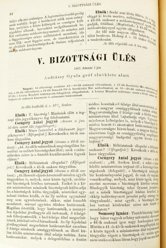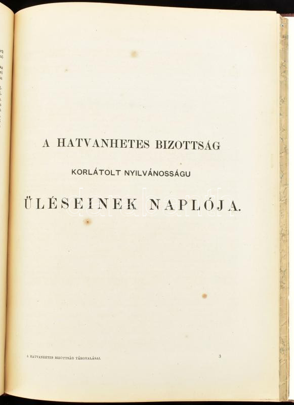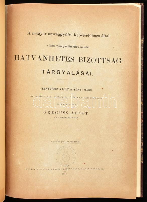 A magyar oszággyülés képviselőháza által a közös viszonyok tárgyában kiküldött hatvanhetes bizottság tárgyalásai. Szerk.: Greguss Ágost. Pest, 1867, Emich Gusztáv, 1 sztl. lev. + 128+(1) p. Aranyozott gerincű félvászon-kötésben (Leszik-kötés), márványozott lapélekkel, régi intézményi bélyegzőkkel. (A 67 tagból álló, gróf Andrássy Gyula által vezetett ,,hatvanhetes bizottság" képviselte Magyarországot az Ausztriával való közös ügyekkel kapcsolatos tárgyalásokban a kiegyezés idején.)