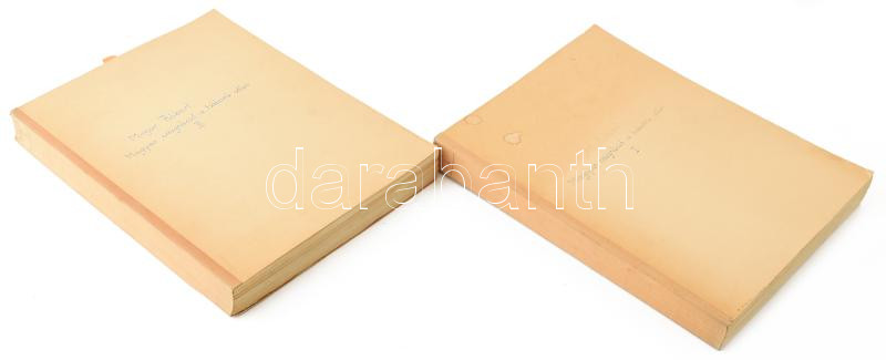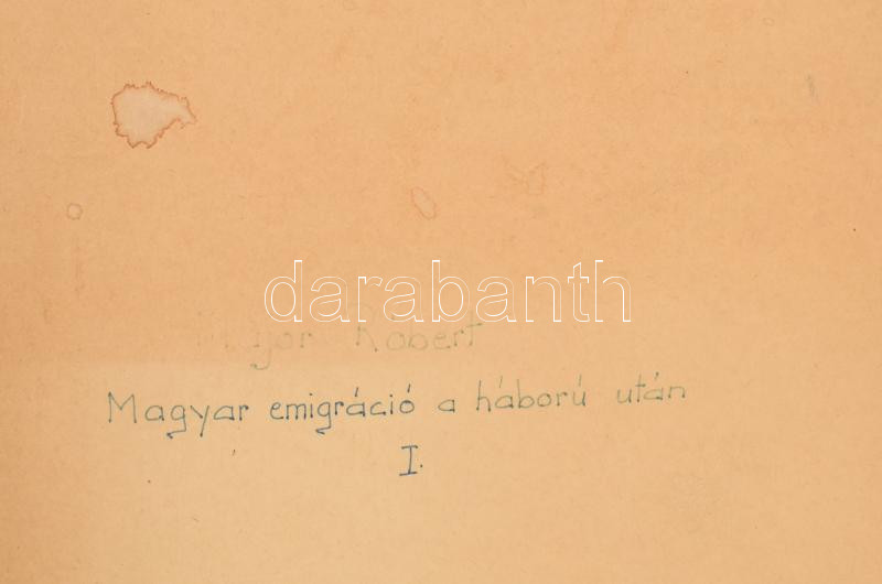 Major Róbert (1896-1985): Magyar emigráció a háború után. I-II. kötet. Gépirat. Nyomtatásban valószínűleg nem jelent meg. [Bécs, 1974.], 4 sztl. lev. 203 p.; 204-420 p.+2 sztl. lev+28 p.+ 3 sztl. lev.+ A II. kötet végére kötve regiszteres füzetben kéziratos névmutatóval. Kiadói papírkötésben, a szövegben a szerző sajátkezű javításaival, kiegészítéseivel, az I. kötet elülső borítója kissé foltos. Major Róbert (1896-1985) közgazdasági és politikai író. A Pázmány Péter Tudományegyetem Bölcsészkarán végzett, Eötvös-kollégium ösztöndíjasa volt. Részt vett az első világháborúban. Politikai és közgazdaságtani tanulmányai jelentek meg a Századunk és a Közgazdasági Szemle hasábjain. Publikált a Népszava, a Szocializmus, a Szép Szó, a Jelenkor és a Magyar Fórum c. lapban is. A háború után, 1945-ben a Közgazdaság és a Kis Újságot szerkesztette, majd kinevezeték a Magyar Közgazdasági Társaság igazgatójává. 1947-ben elhagyta Magyarországot, Rómában, később New Yorkban élt. De munkatársa volt a müncheni Látóhatár c. lapnak is. 1971-től Bécsben élt. Emigráns lapokban publikált.