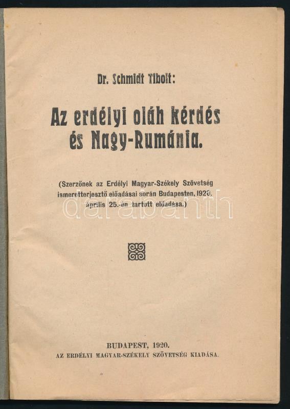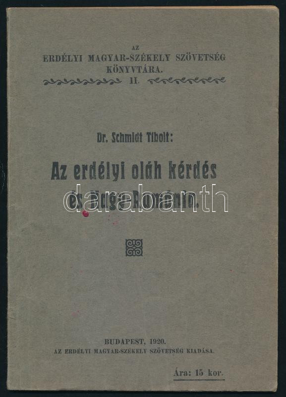 Schmidt Tibolt: Az erdélyi oláh kérdés és Nagy-Románia. Erdélyi Magyar... https://www.darabanth.com/de/41-Gross-Auktion/41.1/Bucher/Bucher-Geschichte~16820/Schmidt-Tibolt-Az-erdelyi-olah-kerdes-es-Nagy-Romania-Erdelyi-Magyar-Szekely-Szovetseg-K~II2998709