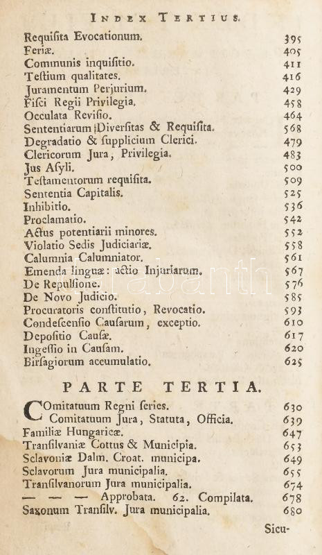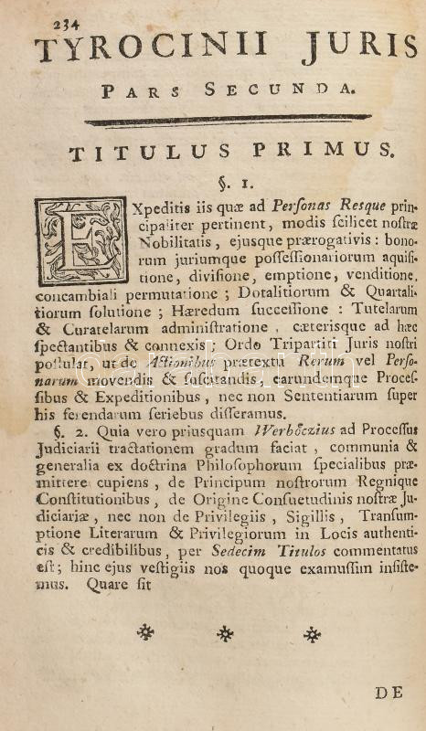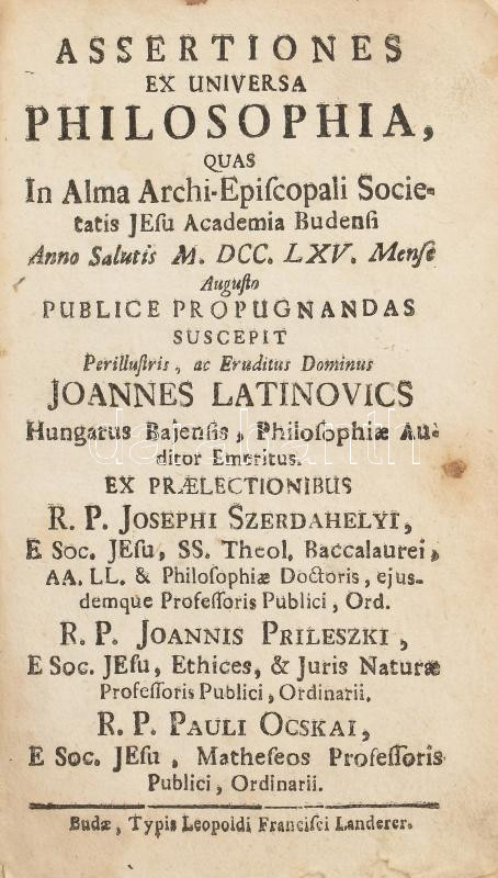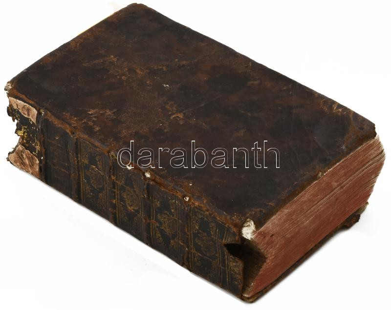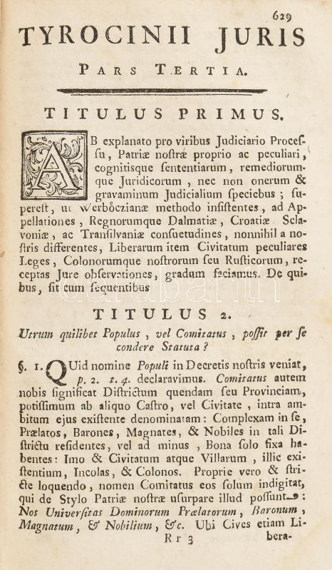 [Mező-szegedi Szegedi János (1699-1770)] Joannes Szegedi: Tripartitum juris Hungarici tyrocinium, juxta ordinem tripartiti, sacris canonibus accommodatum. Authore R. P. - - . I-III. rész egybekötve, folyamatos lapszámozással. (Az elejére hozzákövete: Assertiones ex universa philosophia, quas in alma Archi-episcopali Societas Jesu Academia Budensi, anno domini M. DCC. LXV. Mense Augusto publice propugnandas suscepit. Perillustric, ac Eruditus Dominus Joannes Latinovics... Budae, 1755, Typis Leopoldi Francesci Landerer.) Tyrnaviae [Nagyszombat], 1751., Typis Academicis Societatis Jesu, 4 p.+12 sztl. lev. (plusz bekötött oldalak: Assertiones ex universa philosophia, quas in alma Archi-episcopali ...)+5-856 p.+20 sztl. lev. Latin nyelven. Korabeli aranyozott gerincű egészbőr-kötésben, kopott borítóval, sérült gerinccel, az elülső szennylap hiányzik, a hátsó szennylap sérült hiányos, az utolsó lap sarkán hiánnyal, foltos lapokkal, tulajdonosi bélyegzéssel, és névbejegyzésekkel a könyvben.