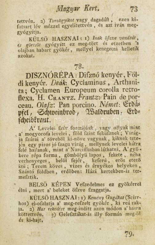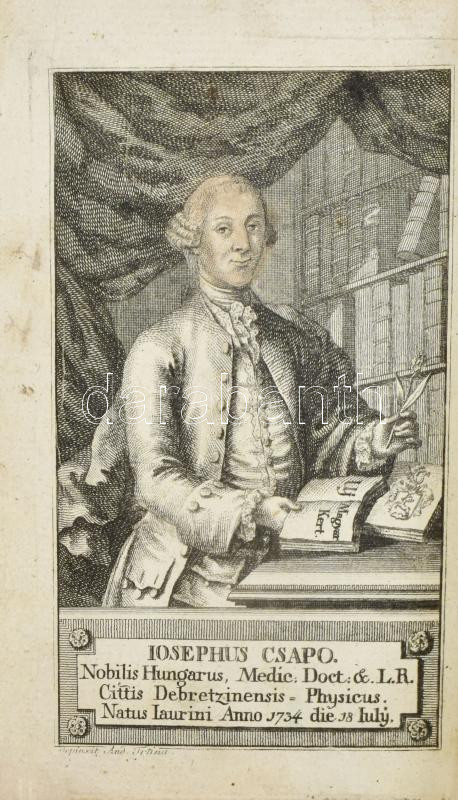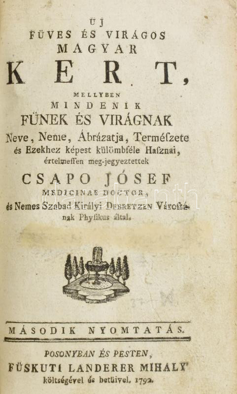 [Csapó József]: Csapo József: Új füves és virágos magyar kert, mellyben mindenik fűnek és virágnak, neve, neme, ábrázatja, természete és ezekhez képest külömbféle hasznai, értelmessen meg-jegyeztettek. Pozsony, 1792. Füskúti Landerer Mihály, 1 t. (rézmetszetű címkép)+4+305 p. + 33 sztl lev. Korabeli félbőr kötésben. A szerző, Csapó József (1734-1799) Debrecen város főorvosa volt, ezen művének fő célja az orvosilag használható növények, gyógynövények bemutatása volt, a leírt több száz növényfaj neveit öt nyelven is közli, de munkája inkább orvosi, mint botanikai jellegű.
