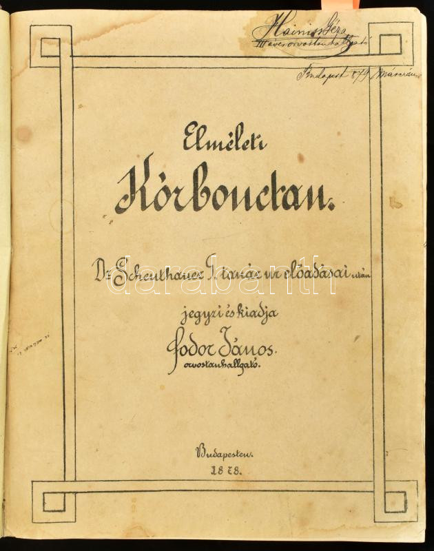 Scheuthauer Gusztáv: Elméleti kórbonctan. Dr. - - tanár ur előadásai után jegyzi és kiadja Fodor János orvostanhallgató. Bp., 1878., nyn., 4+203+31-322+III p. Stencilezéssel sokszorosított egyetemi jegyzet. Korabeli átkötött félvászon-kötésben, kopott borítóval, foltos lapokkal, egy-két lapszéli rajzzal, az utolsó lapon javítással. Dr. Hainiss Géza (1857-1926) gyógyszerész, gyermekorvos, egyetemi magántanár névbejegyzésével, dátumozva (1879.)