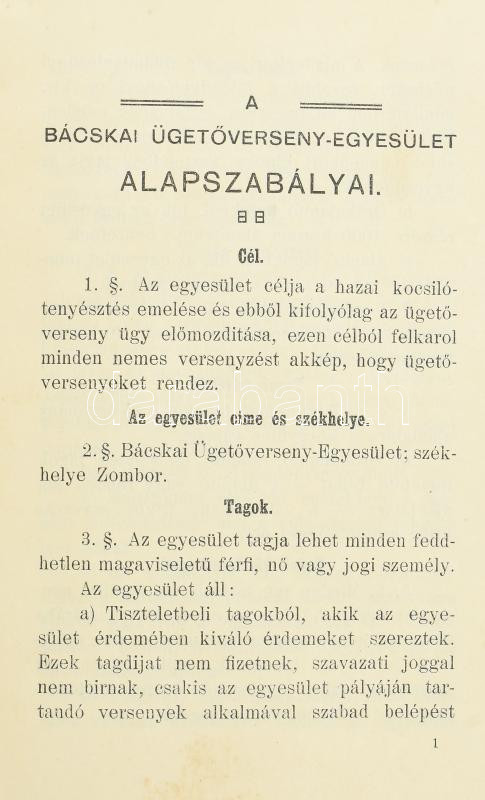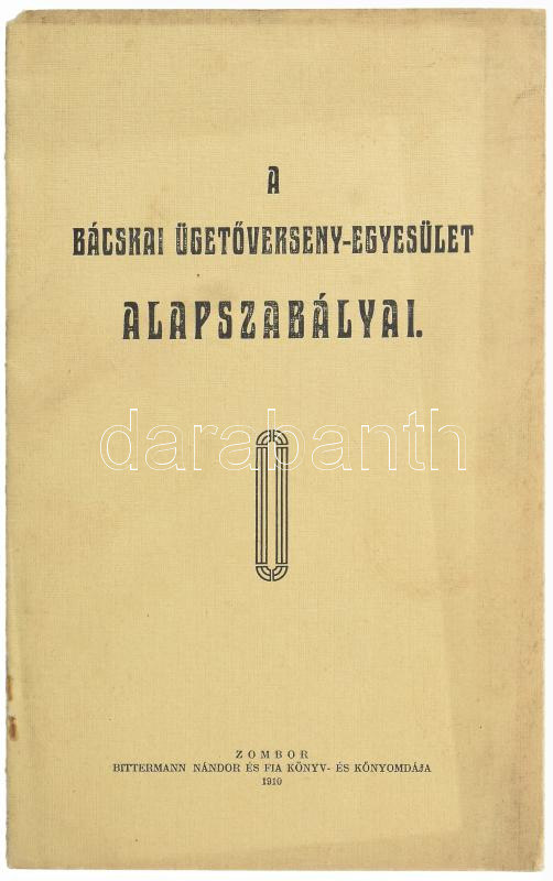 A Bácskai Ügetőverseny-Egyesület alapszabályai. Zombor, 1910. Bitterma... https://www.darabanth.com/de/41-Gross-Auktion/41.1/Bucher/Bucher-Pferde~16822/A-Bacskai-Ugetoverseny-Egyesulet-alapszabalyai-Zombor-1910-Bittermann-10p-Kiadoi-papirbo~II3009100