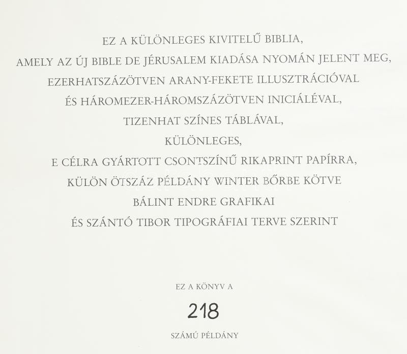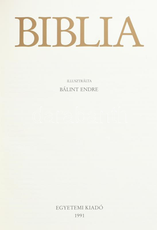 Biblia. Bálint Endre illusztrációival. Ford.: Dr. Gál Ferenc et al. Bp., 1991, Egyetemi Kiadó. Kiadói egészbőr-kötés, kiadói kartonált tékában, az első néhány lap kissé hullámos. Számozott (218./500) példány!
