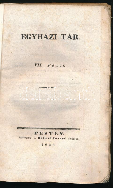 Egyházi tár. VII. füzet. [Szerk: Guzmics Izidor.] Pesten, 1836, Beimel Jósef, 1 (Váczi Főtemplom, acélmetszet) t.+155 p. Kiadói papírkötés, a borítón a gerincnél szakadt és a szakadásnál két íven gyűrődéssel, foltos lapokkal.