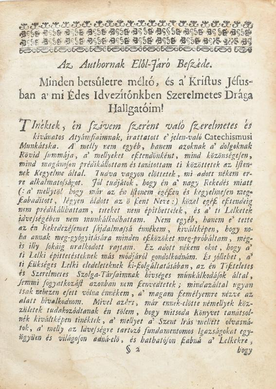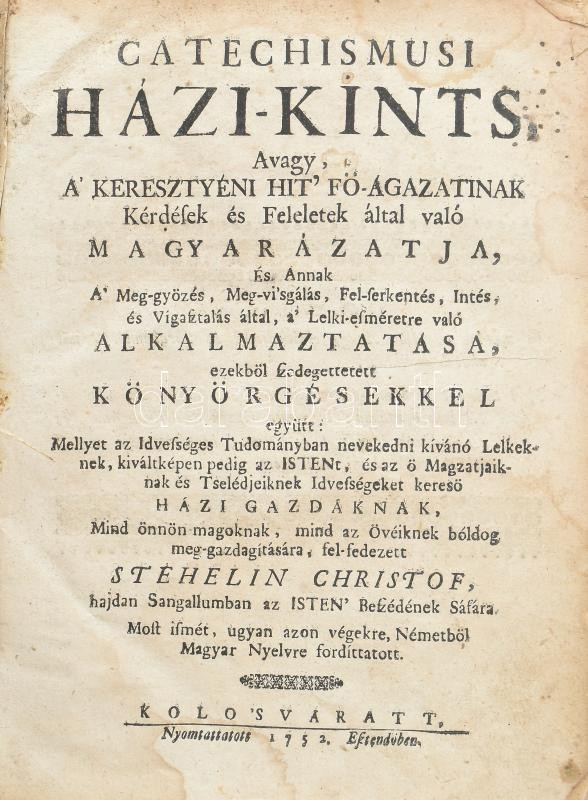 Stehelin Christof: Catechismusi Házi-Kints, Avagy, A' Keresztyéni Hit' Fö-Ágazatinak Kérdések és Feleletek által való Magyarázatja, És Annak a Meg-győzés, Meg-visgálás, Fel-serkentés, Intés és Vigasztalás által, a Lelkiesméretre való Alkalmaztatása, ezekből szedegettetett Könyörgésekkel együtt: Mellyet az Idvességes Tudományban nevekedni kivánó Lelkeknek, kiváltképen pedig az Istent és az ő Magzatjaiknak és Tselédjeiknek Idvességet kereső Házi Gazdáknak, Mind önnön-magoknak, mind az övéiknek bóldog meg-gazdagítására, fel-fedezett - -, hajdan Sangallumban az ISTEN' Beszédének Sáfára. Most ismét, ugyanazon végekre, Németből Magyar Nyelvre fordíttatott. Kolo'sváratt, 1752., ny.n., 16+863+1 p. Korabeli bordázott gerincű egészbőr kötésben, kisebb sérülésekkel. A kiadvány az Erdélyi Református Egyház Főkonzisztóriumának nyomdájában, Pataki István nyomdász munkájával készült. A fordítást Tatai Csirke Ferenc (1707-1765) debreceni lelkész készítette. Neve azért nem szerepel a kiadványban, mert Magyarországon ekkor tiltották a Káté terjesztését. Az első 18. századi erdélyi, nyomtatásban megjelent magyar nyelvű kátémagyarázat.Eredeti, vallási célja mellett fontos társadalomformáló szerepe volt. A bécsi udvarral szembeni ellenállókat gyűjtötte közösségbe. 1753-tól Erdélyben is tiltották, így a megjelent kevés példány gyorsan elfogyott. Ritka, és fontos egyházi munka!
